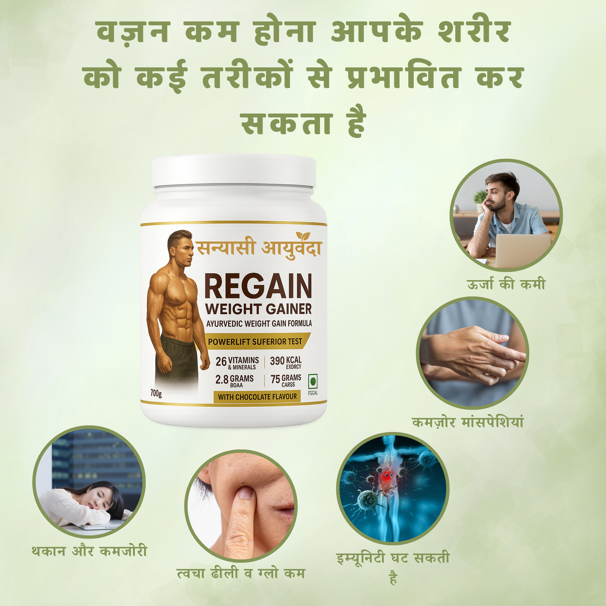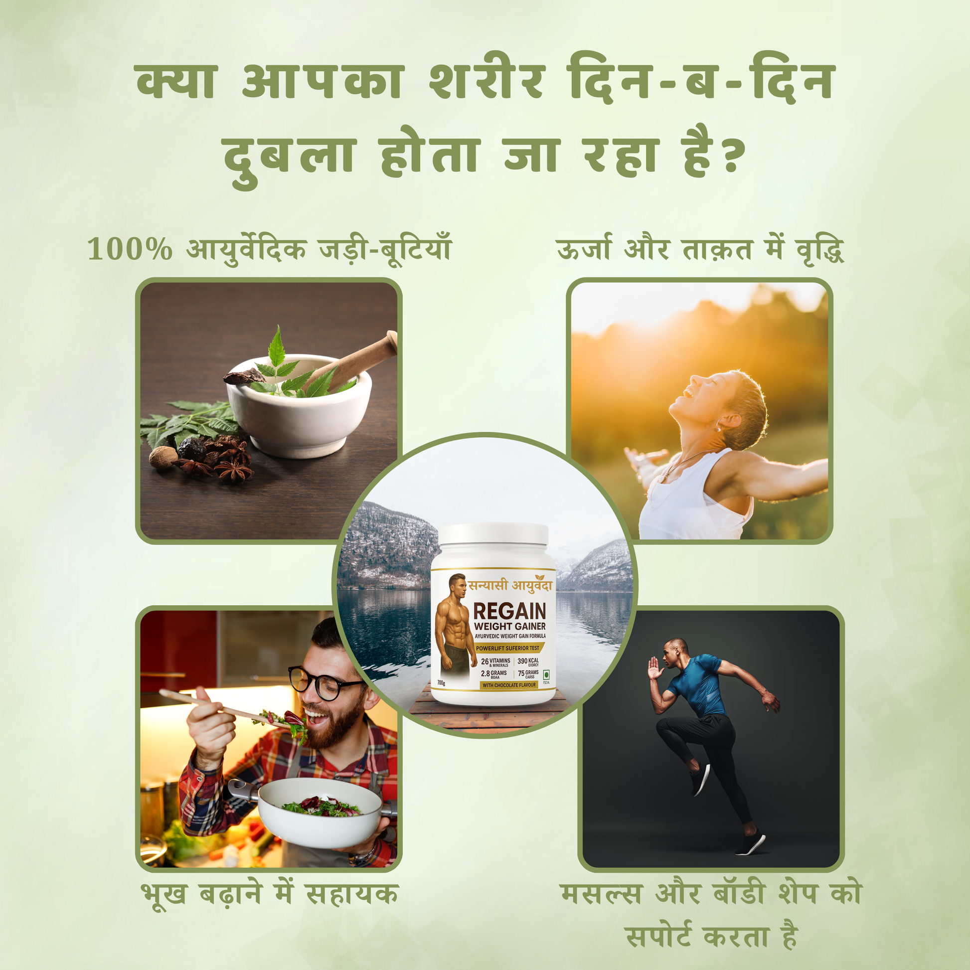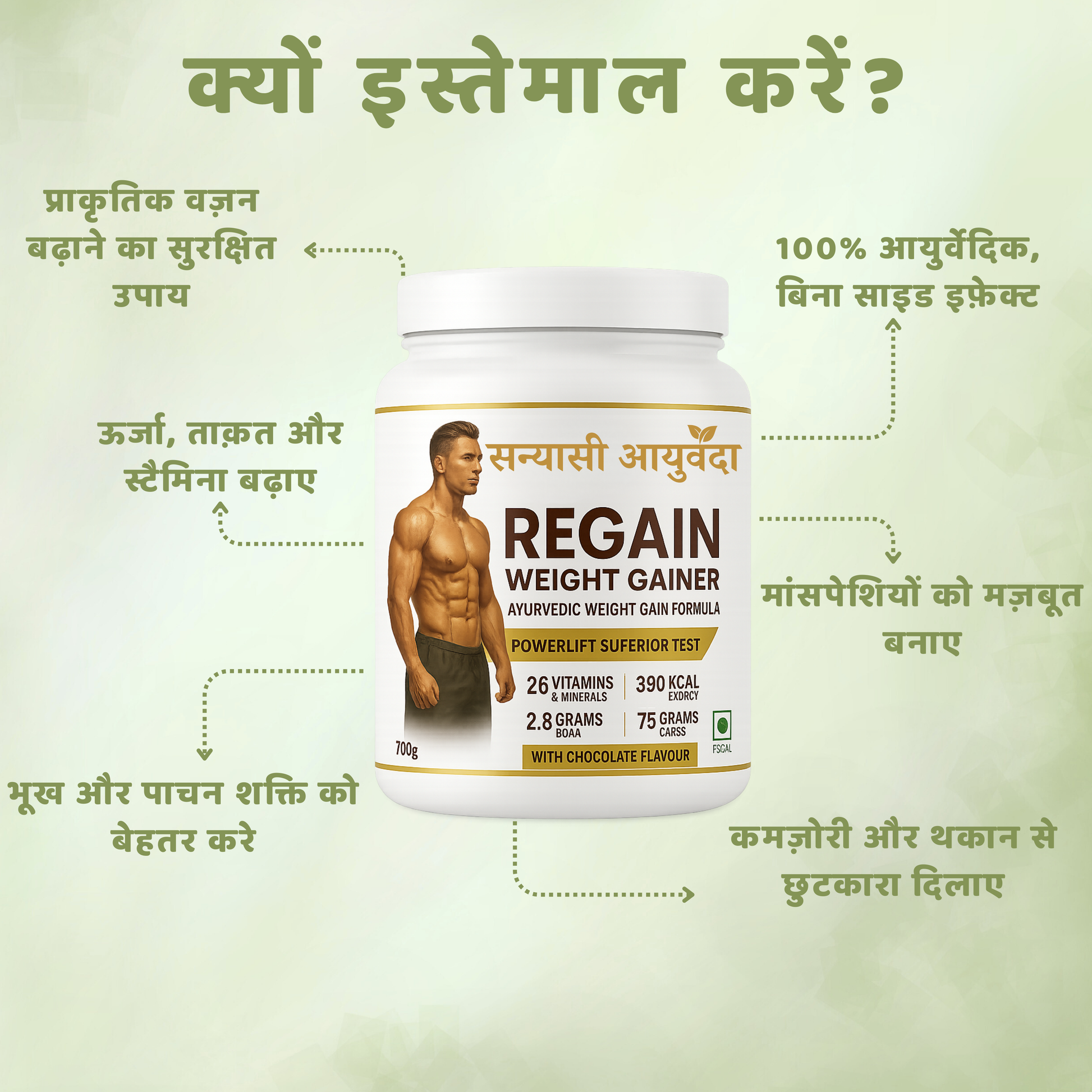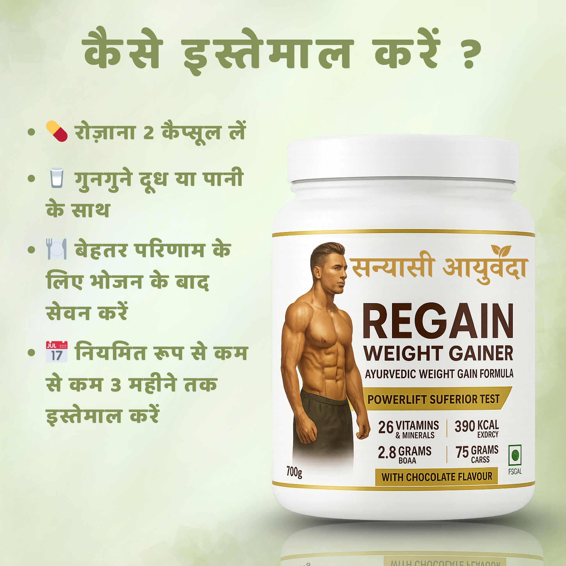 Sanyasi Ayurveda का REGAIN Weight Gainer एक प्रीमियम आयुर्वेदिक फ़ॉर्मूला है जो आपके शरीर को प्राकृतिक तरीक़े से वज़न बढ़ाने और मसल्स बनाने में मदद करता है। इसमें 26 Vitamins & Minerals, 75g Carbs, 2.8g BCAA और 390 Kcal Energy है जो आपके शरीर को शक्ति, सहनशक्ति और हेल्दी वज़न प्रदान करता है। 👉 इसका स्वादिष्ट चॉकलेट फ्लेवर इसे रोज़ाना लेना आसान और मज़ेदार बनाता है।